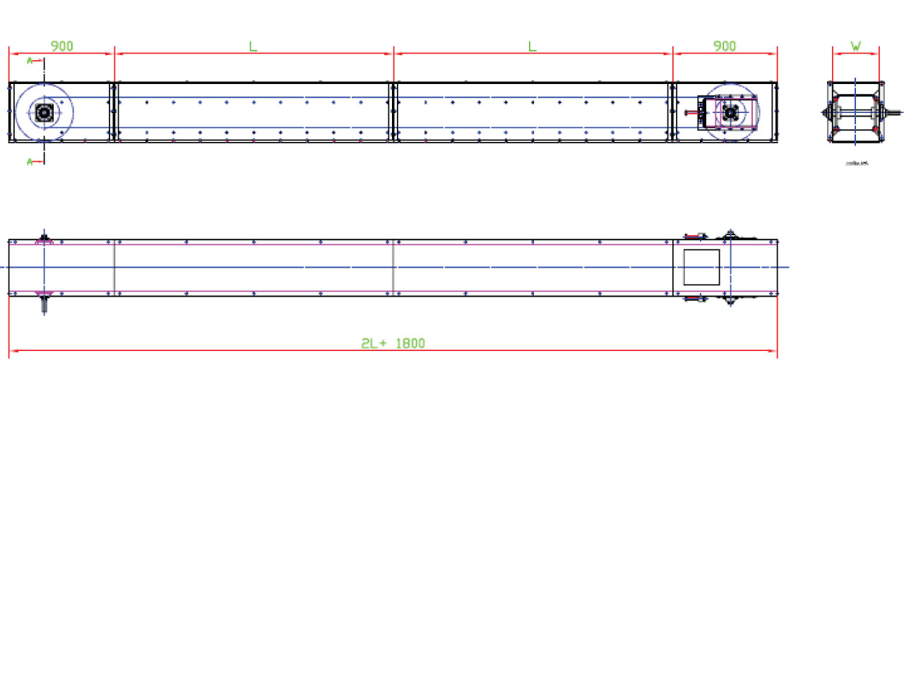 CHAIN CONVEYOR แบบใช้โซ่คู่ เป็นเครื่องลำเลียงวัสดุที่ใช้โซ่ 2 เส้น ติดตั้งอยู่ด้านข้างของรางขนถ่ายวัสดุ และมีใบกวาดยึดติดกับข้อโซ่ทั้งสองด้านเป็นช่วง ๆ เพื่อกวาดวัสดุให้เคลื่อนที่ไปตามราง โดยวัสดุจะถูกใบกวาดดันให้เคลื่อนที่จากทางปลายด้านหนึ่งไปยังปลายอีกด้านหนึ่งของราง ซึ่งเจาะช่องทางจ่ายวัสดุไว้