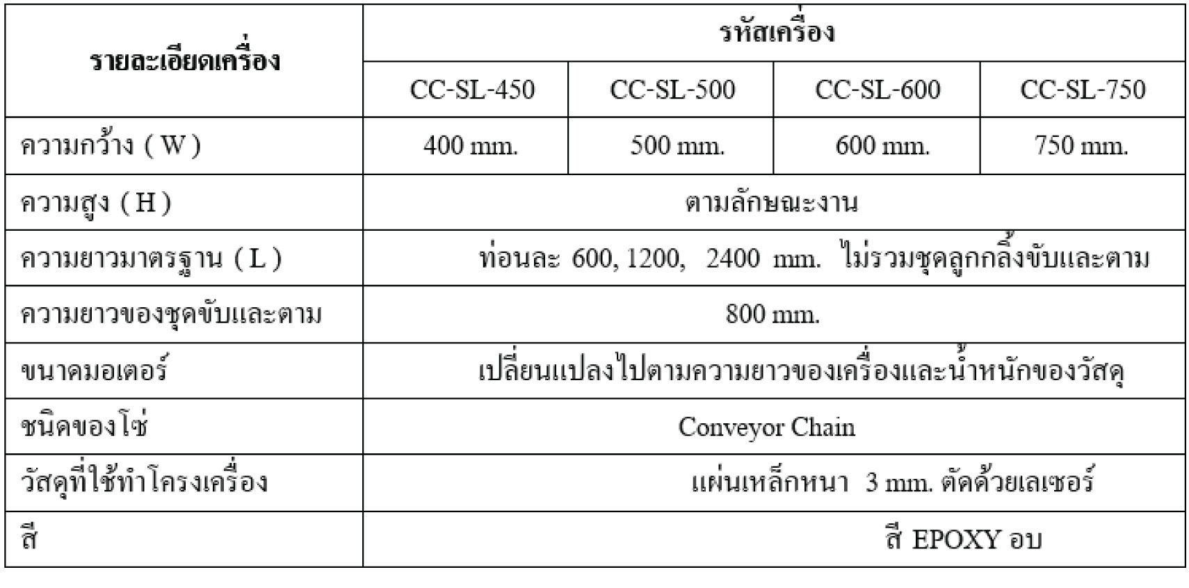 SLAT CHAIN ONVEYOR จะเหมาะสำหรับใช้ขนถ่ายวัสดุที่มีฐานเรียบ มีน้ำหนักค่อนข้างมาก เช่น กล่องบรรจุสินค้า ตัวรองรับสินค้า (PALLET) หรือสินค้าที่มีรูปทรงสี่เหลี่ยม เป็นต้น และเป็นงานขนถ่ายวัสดุที่ต้องการความเร็วในการเคลื่อนที่ต่ำ