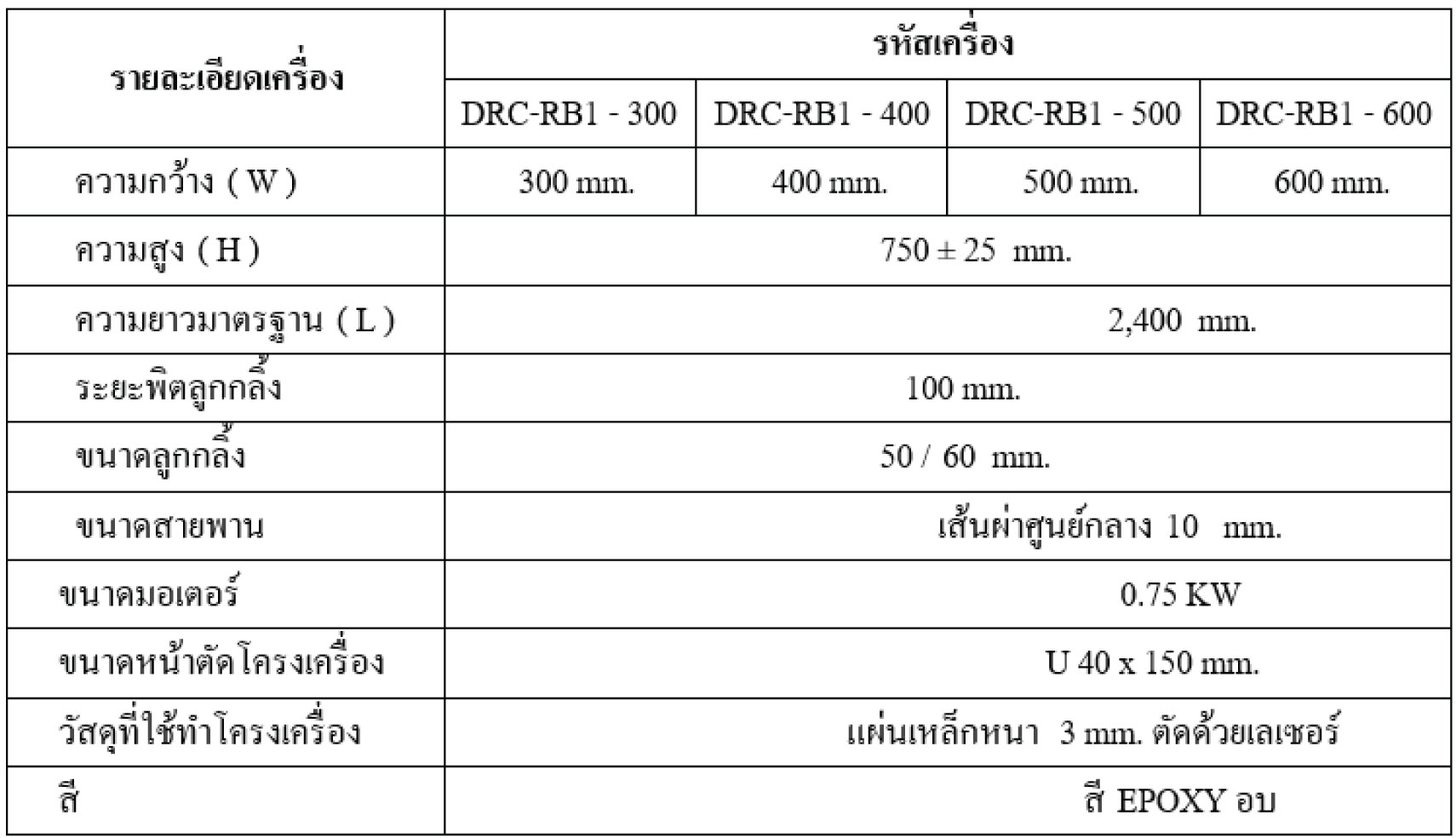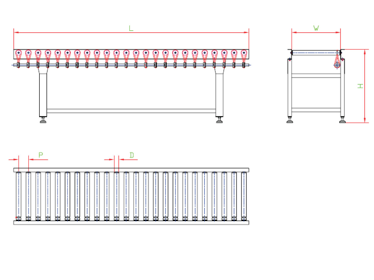 ลูกกลิ้งที่ใช้จะมีขนาดเส้นผ่าศูนย์กลางเท่ากับ 50 mm. และ 60 mm. แต่ถ้าต้องการขนาดลูกกลิ้งที่โตกว่านี้ก็สามารถเปลี่ยนแปลงได้ตามน้ำหนักที่ลูกกลิ้งรับภาระสำหรับความยาวของเครื่องแต่ละตัวจะมีความยาวเท่ากับ 2,400 mm. ในกรณีที่ต้องการขนถ่ายวัสดุเป็นระยะทางไกล ๆ ผู้ใช้งานจะต้องใช้เครื่องลำเลียงหลายตัวมาต่อกันจนได้ความยาวตามต้องการ